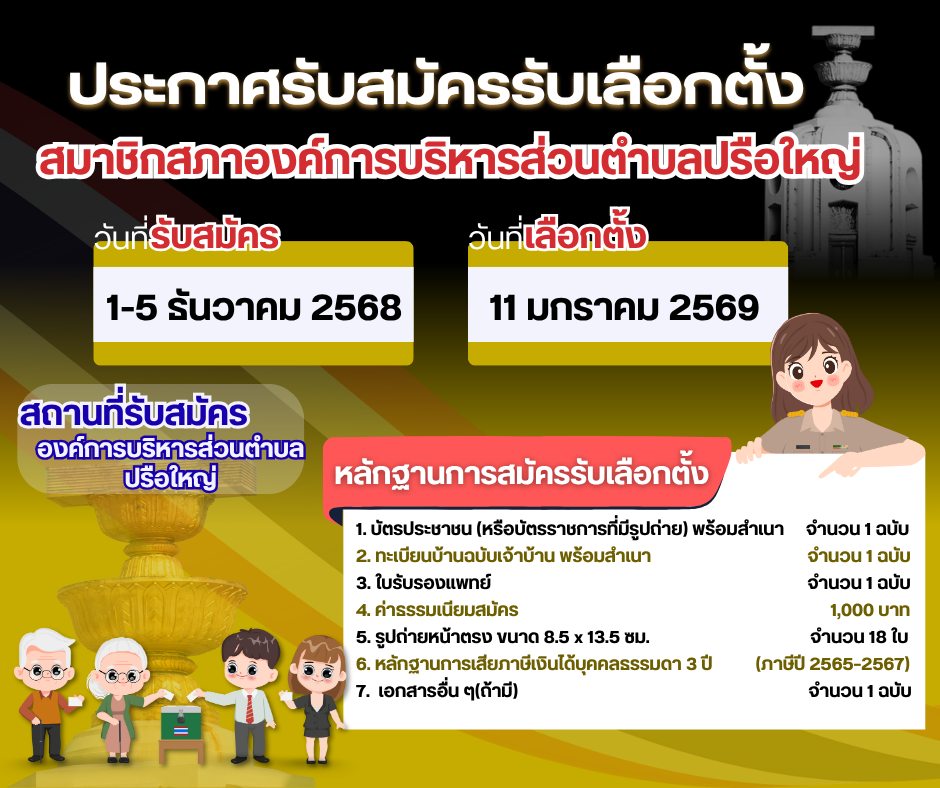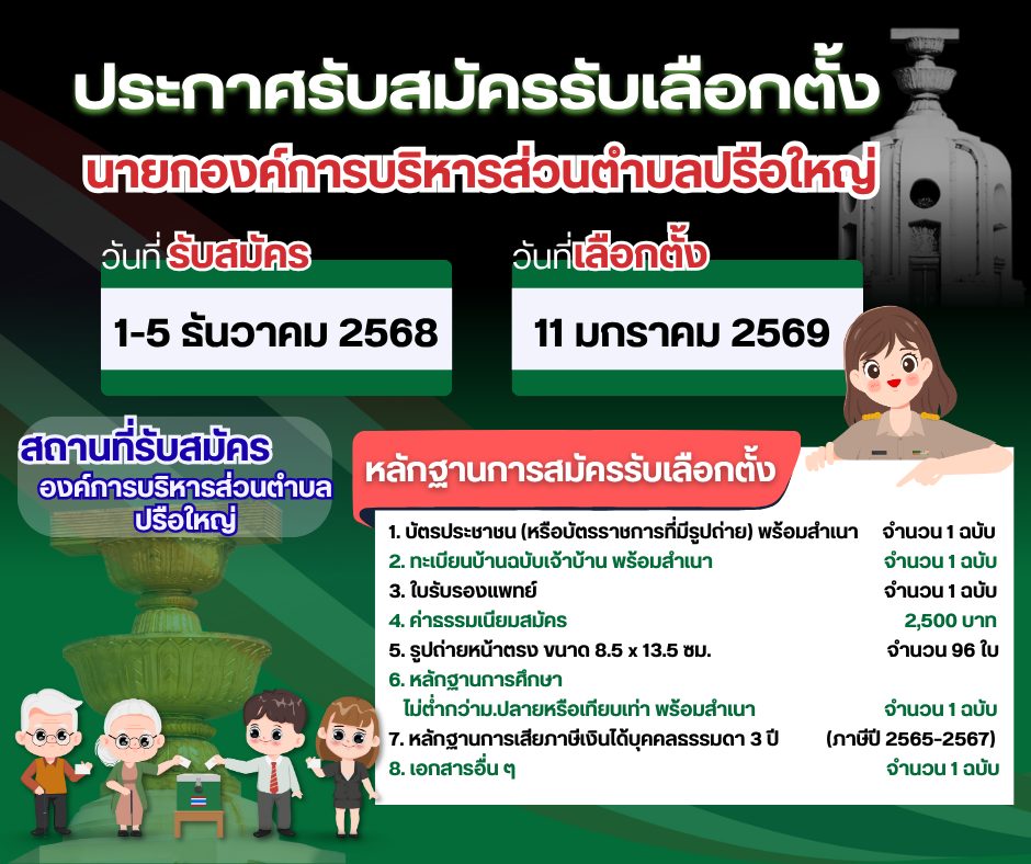 ประกาศประชาสัมพันธ์ เรื่อง คุณสมบัติและลักษณะต้องห้ามของผู้สมัครรับเลือกตั้ง สมาชิกสภาองค์การบริหารส่วนตำบลปรือใหญ่ และนายกองค์การบริหารส่วนตำบลปรือใหญ่